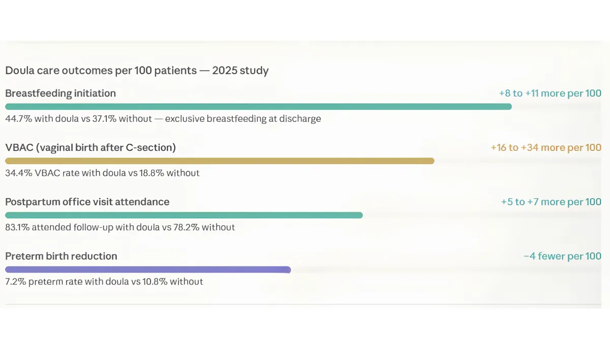 Cochrane review of 26 randomized trials found continuous doula support reduces C-sections and improves birth satisfaction